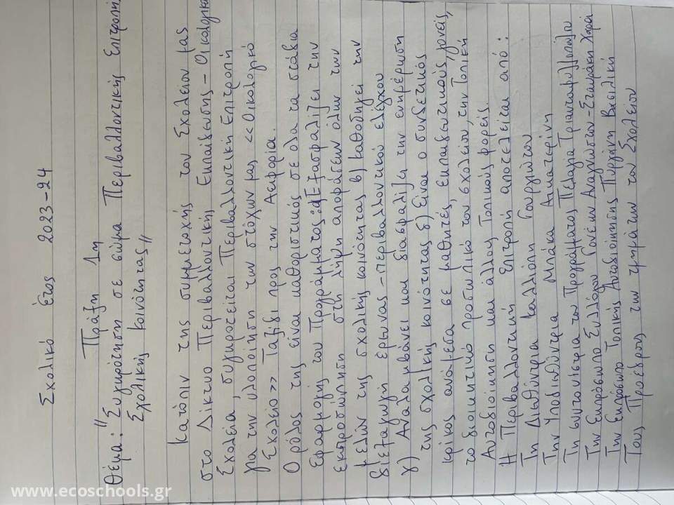 Η επιτροπή όρισε ακόμη την ημερομηνία της πρώτης συνάντησης με θέμα << Περιβαλλοντικός Έλεγχος του σχολείου μας>> .Ο περιβαλλοντικός έλεγχος θα αφορά διάφορους τομείς περιβαλλοντικού ενδιαφέροντος, όπως ενέργεια, νερό, απορρίμματα, σχολική αυλή, υγιεινή διατροφή κ.ά., παίρνοντας βέβαια υπόψη και τις ανάγκες του σχολείου. Προτείνεται ένα ερωτηματολόγιο , που η συμπλήρωσή του θα καθορίσει και το περιβαλλοντικό θέμα με το οποίο οι μαθητές θα ασχοληθούν το τρέχον σχολικό έτος.