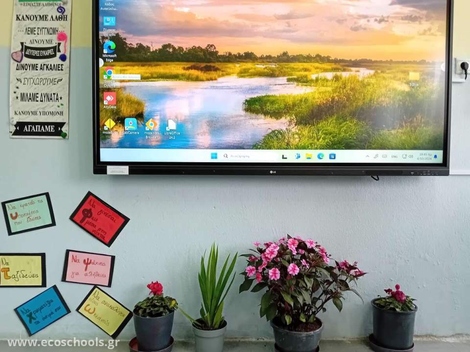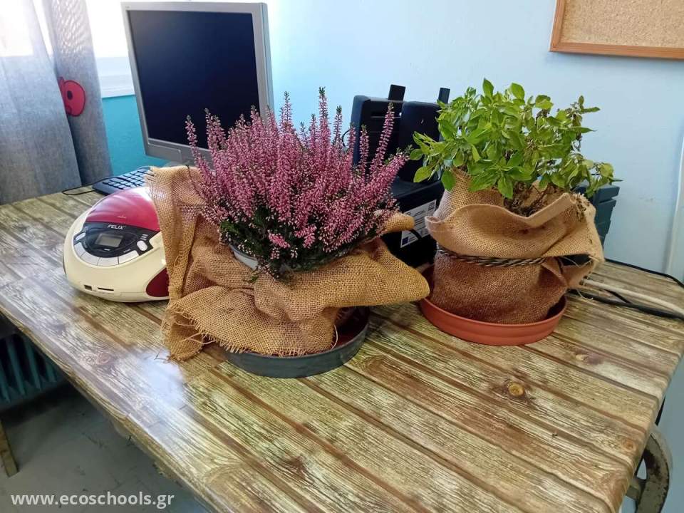 Μαθητές κι εκπαιδευτικοί αποφάσισαν να στολίσουν φέτος τις αίθουσες και τους χώρους του σχολείου, εκτός από εργασίες και κατασκευές, με όμορφα λουλούδια, τα οποία ανέλαβαν να περιποιούνται.