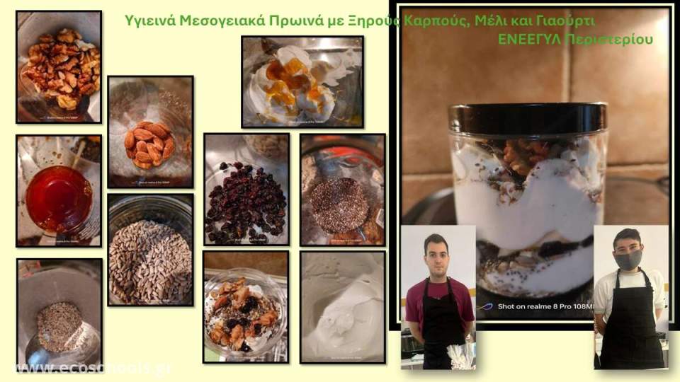 Οι μαθητές έφεραν διάφορα προϊόντα από το σπίτι τους (μέλι, ξηρούς καρπούς, γιαούρτι, σταφίδες, βρώμη) και πρότειναν ένα υγιεινό πρωινό το οποίο μπορούν να παίρνουν μαζί τους σε γυάλινα βαζάκια στο σχολείο και σε οποιαδήποτε δραστηριότητα μικροί και μεγάλοι.