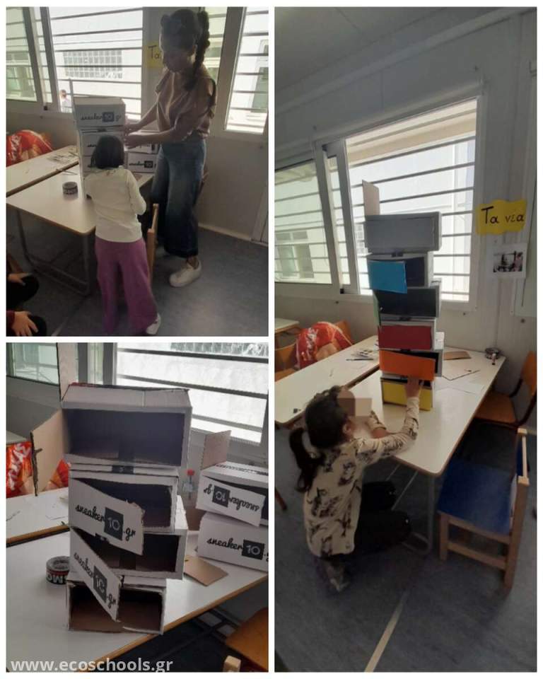 Οι υπόλοιποι εκπαιδευτικοί του σχολείου θέλοντας κι αυτοί να συμβάλλουν με δράσεις στην προστασία του περιβάλλοντος έφτιαξαν παιχνίδια από χαρτόκουτες ( κουζίνα και πλυντήριο) καθώς και μια ραφιέρα για να αποθηκεύουν οι μαθητές τις εργασίες τους. Το αποτέλεσμα ήταν καταπληκτικό και οι μαθητές διασκέδασαν πολύ παίζοντας συμβολικά με την κουζίνα και το πλυντήριο αλλά και διακοσμώντας το δικό τους ράφι.