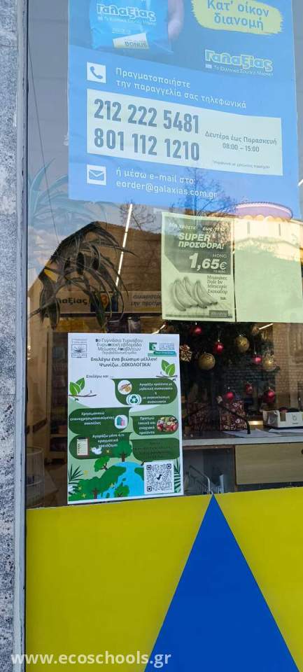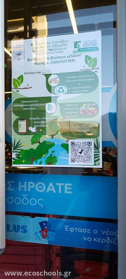1η δράση με τίτλο "Ψωνίζω... Οικολογικά" οι μαθητές της περιβαλλοντικής ομάδας δημιούργησαν αφίσα με το πρόγραμμα Canva Η αφίσα αναρτήθηκε σε σούπερ- μάρκετ και μαγαζιά της πόλης μας, με στόχο την ευαισθητοποίηση των πολιτών για την ανάγκη αντιμετώπισης του αντίκτυπου της σπατάλης τροφίμων στο περιβάλλον .