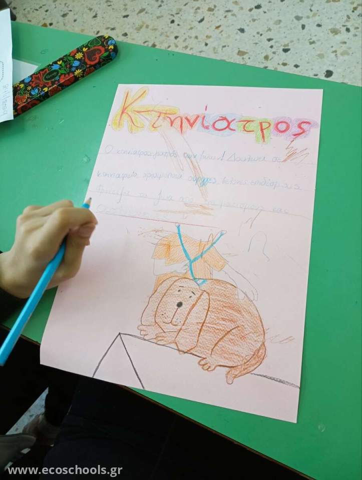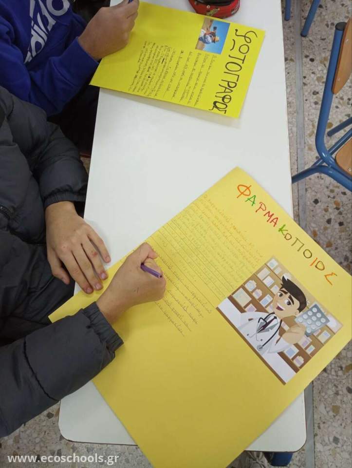 Στόχος της δραστηριότητας αυτής ήταν, να γνωρίσουν οι μαθητές τα επαγγέλματα, να βρουν πληροφορίες και να τις αποτυπώσουν σε ένα σύντομο κείμενο στην αφίσα.