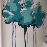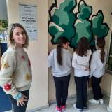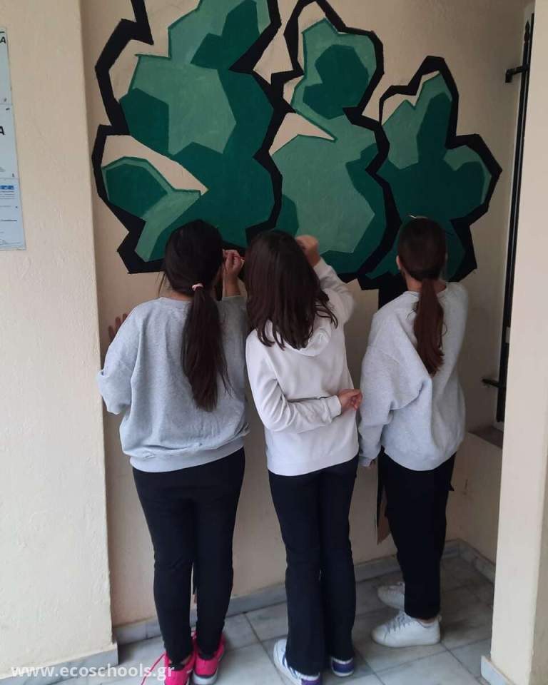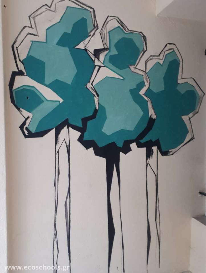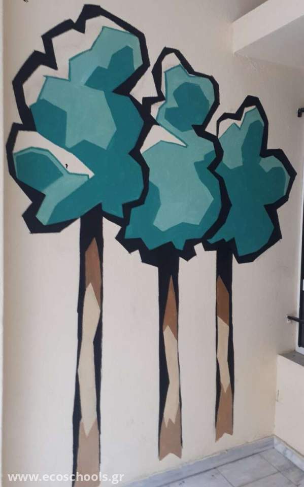 Με την βοήθεια των μαθητών και την επίβλεψη της δασκάλας των εικαστικών δημιουργήσαμε μια λιτή ως προς τις φόρμες και απλή ως προς την εφαρμογή, εικόνα τριών δέντρων. Τα υλικά που χρησιμοποιήθηκαν είναι τα πλαστικά, ακρυλικα χρώματα, φέρνοντας έτσι την εικόνα της φύσης πιο κοντά στο σχολείο.
