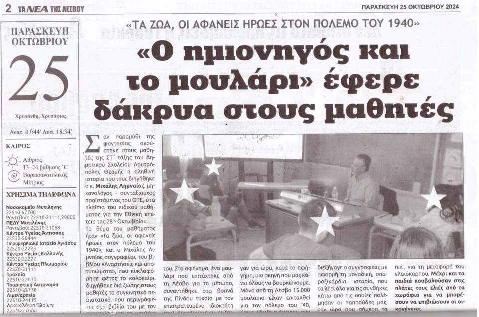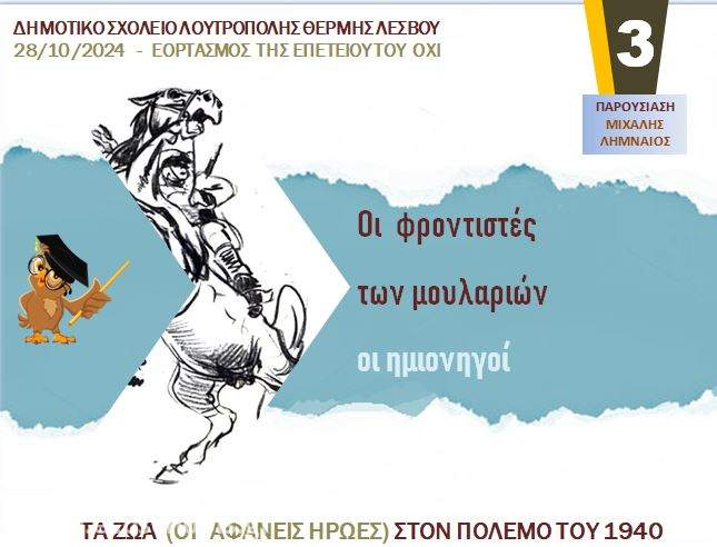 @ Ένα πολύ πρωτότυπο και ενδιαφέρον θέμα ανέπτυξε σήμερα στους μαθητές της ΣΤ΄ τάξης του σχολείου μας ο καλός μας φίλος Μιχάλης Λημναίος, μηχανολόγος –συνταξιούχος προϊστάμενος του ΟΤΕ. Το θέμα ήταν «Τα ζώα , οι αφανείς ήρωες στον πόλεμο του1940».