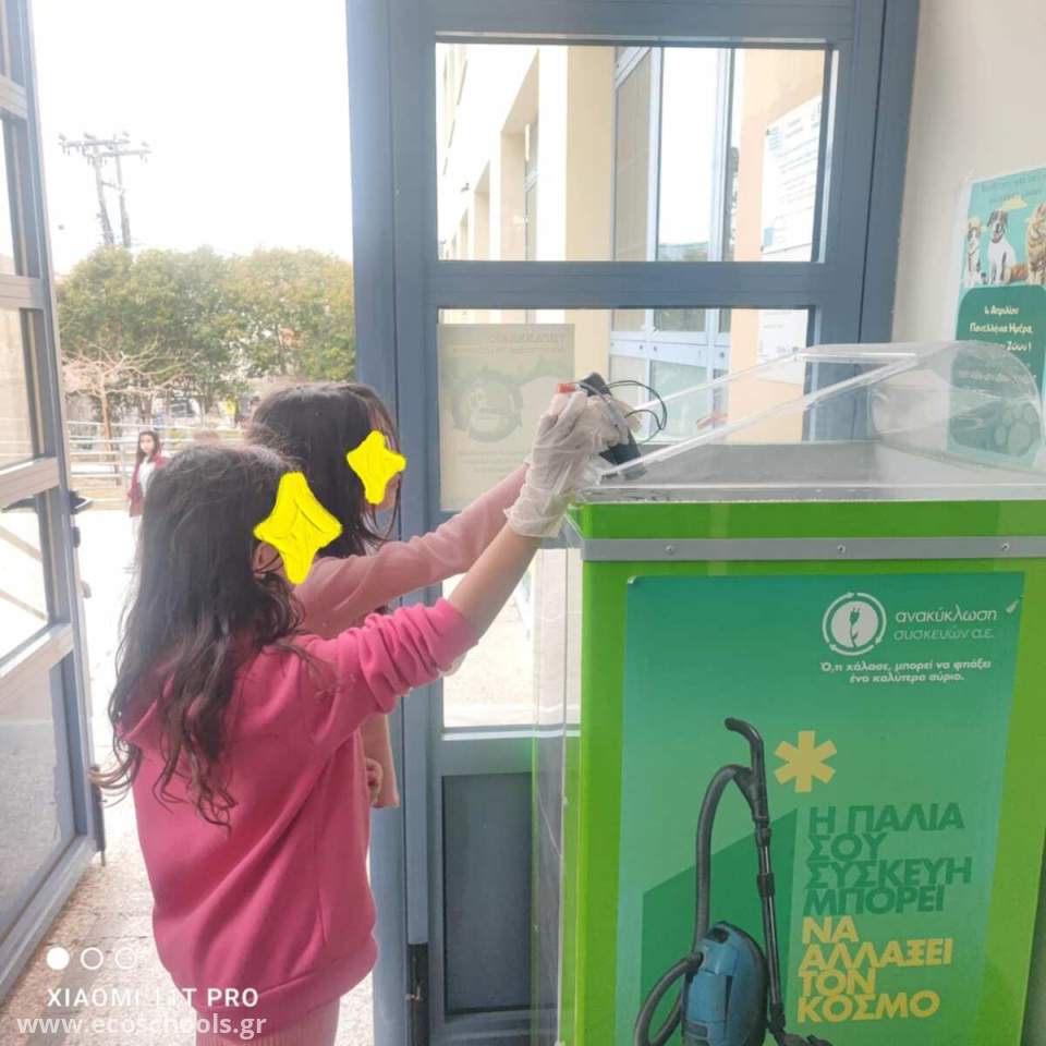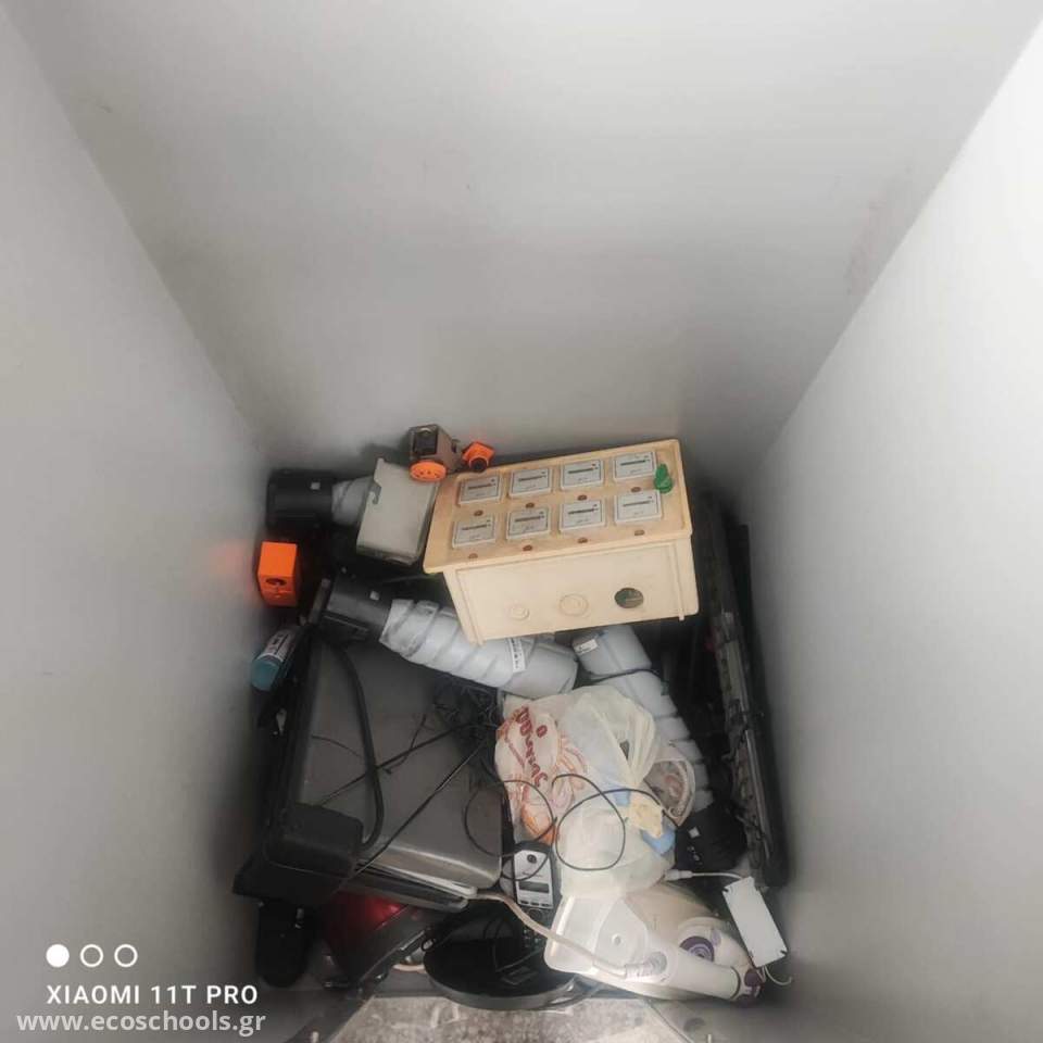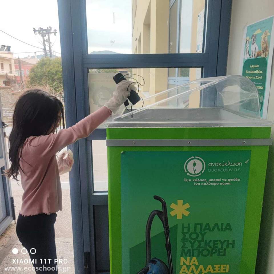 Κατόπιν αιτήματος της μαθητικής κοινότητας στην τοπική εταιρία Ανακύκλωση Αιγαίου τοποθετήθηκε στο σχολείο μας κάδος Ανακύκλωσης Ηλεκτρικών-Ηλεκτρονικών Μικροσυσκευών. Από την αρχή οι μαθητές μας συμμετείχαν ενεργά στις διαδικασίες ανακύκλωσης φέρνοντας από το σπίτι τους παλιές ή μη λειτουργικές ηλεκτρικές-ηλεκτρονικές συσκευές συμβάλλοντας ενεργά στην προσπάθεια αποτελεσματικότερης διαχείρισης των αστικών απόβλητων που διαφορετικά θα κατέληγαν στο ΧΥΤΑ για θάψιμο ή κάπου ανεξέλεγκτα στο περιβάλλον.