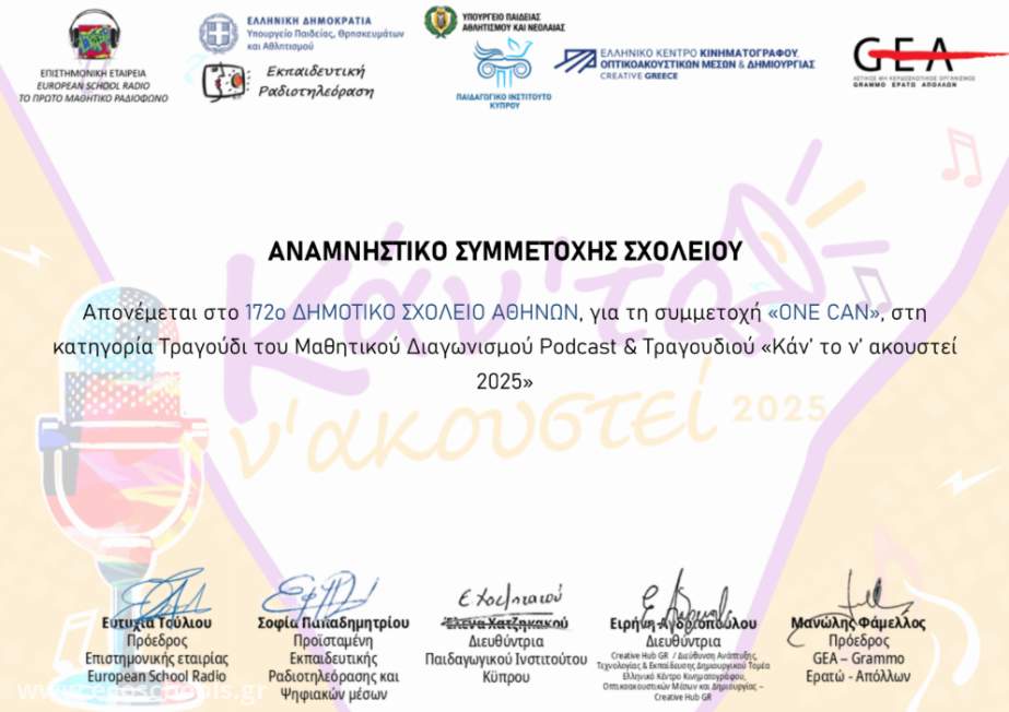 Οι μαθητές της Δ’ τάξης του 172ου Δημοτικού Σχολείου Αθηνών συμμετείχαν στον φετινό μουσικό διαγωνισμό “Κάντο ν’ ακουστεί 2025” του European School Radio με ένα τραγούδι σχετικό με την έννοια της ομαδικότητας και της αλληλεγγύης.