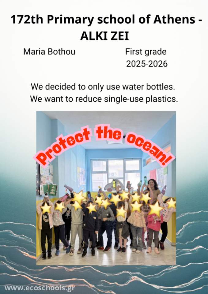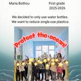 Επιπλέον, για την προστασία του ωκεανού και τη μείωση του πλαστικού δεσμεύτηκε η τάξη μας να χρησιμοποιεί μόνο παγούρια και όχι πλαστικά μπουκάλια μιας χρήσης. Στείλαμε και την αφίσα μας.