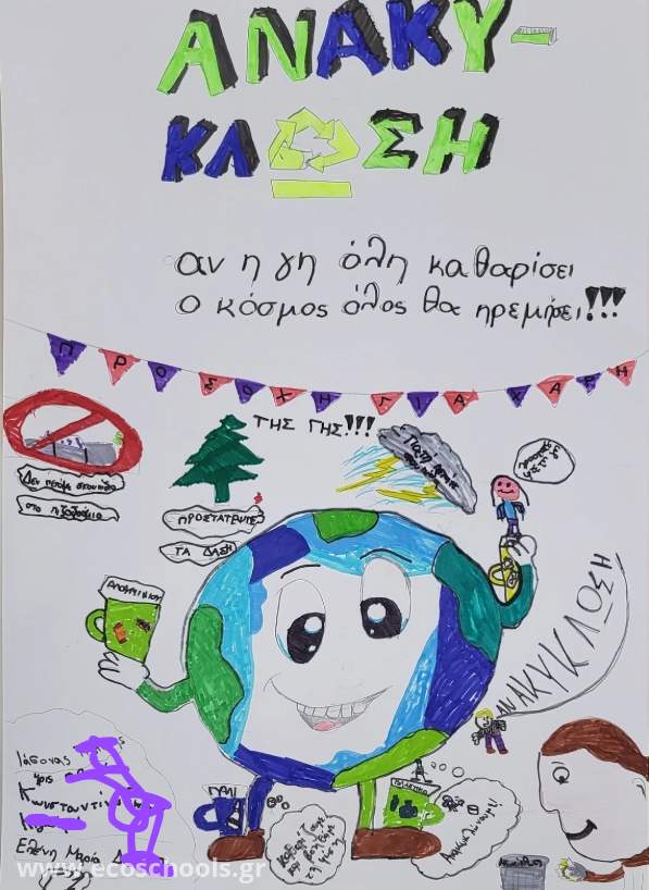 Οι μαθητές του Γ1 συνεργάστηκαν και δημιούργησαν αφίσες για την ανακύκλωση. Οι αφίσες τοποθετήθηκαν σε τοίχους του σχολείου, από όπου περνούν καθημερινά όλα τα παιδιά, προκειμένου να υπενθυμίζουν τη σημαντικότητα της ανακύκλωσης για την προστασία του περιβάλλοντος, του πλανήτη και της ζωής μας.