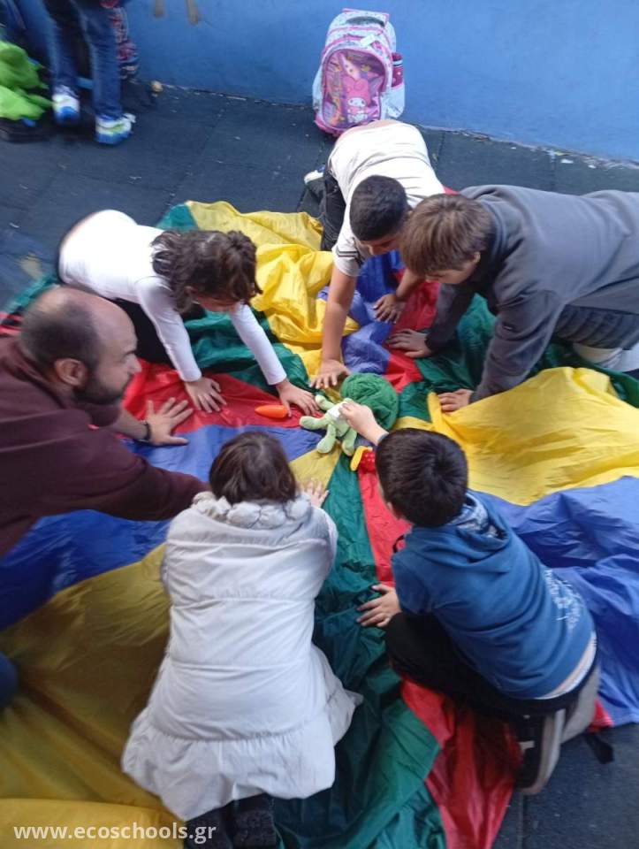 Υλικά: Πολύχρωμο αλεξίπτωτο, λούτρινα ή πλαστικά φρούτα/λαχανικά, μουσική, κώνοι ή σημάδια εδάφους.