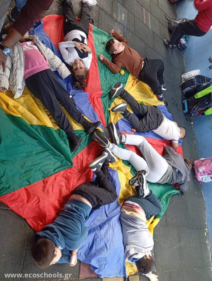 Τα παιδιά ξαπλώνουν επάνω στο αλεξίπτωτο (όπως στη φωτογραφία) και ακολουθούν την οδηγία: