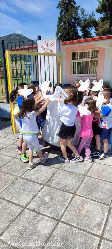 Επίσης συγκεντρώσαμε στο νηπιαγωγείο μας ρούχα, τα οποία δεν τα χρειάζονταν πλέον οι οικογένειες των μαθητών. Δημιουργήσαμε και ζωγραφίσαμε μόνοι μας, ένα μεγάλο τσουβάλι, μέσα στο οποίο τοποθετήσαμε τα ρούχα και τα στείλαμε για νέα χρήση. Η Δράση πραγματοποιήθηκε σε συνεργασία με το Δημοτικό Σχολείο Κριθιάς και με τη συμμετοχή της ευρύτερης Τοπικής Κοινότητας. Τα ρούχα παρέλαβε φορτηγάκι του Δήμου και θα τα διένεμε, εκεί όπου υπήρχε ανάγκη. Η Δράση συμπεριελήφθηκε στην αντίστοιχη Θεματική Δράσεων του Ενεργού Πολίτη.
