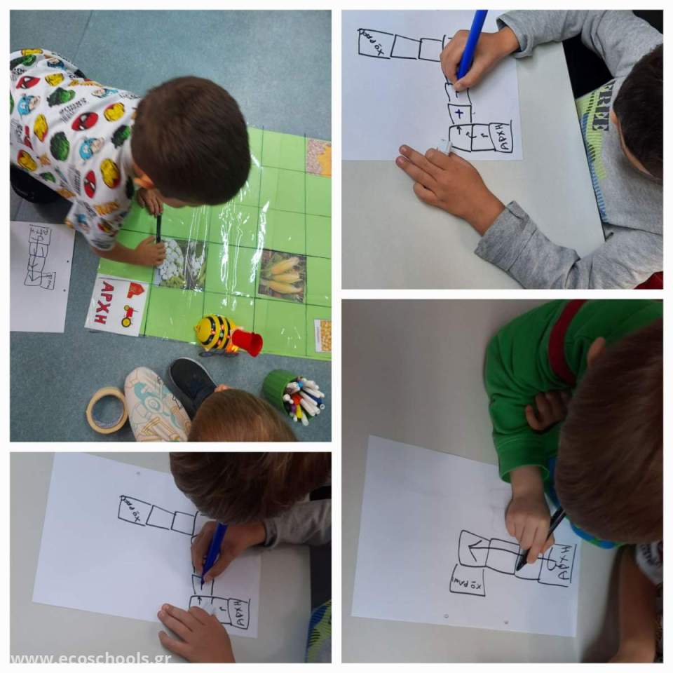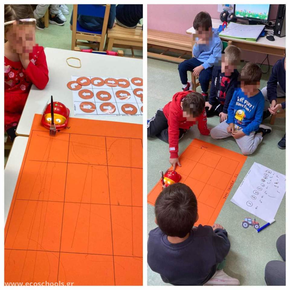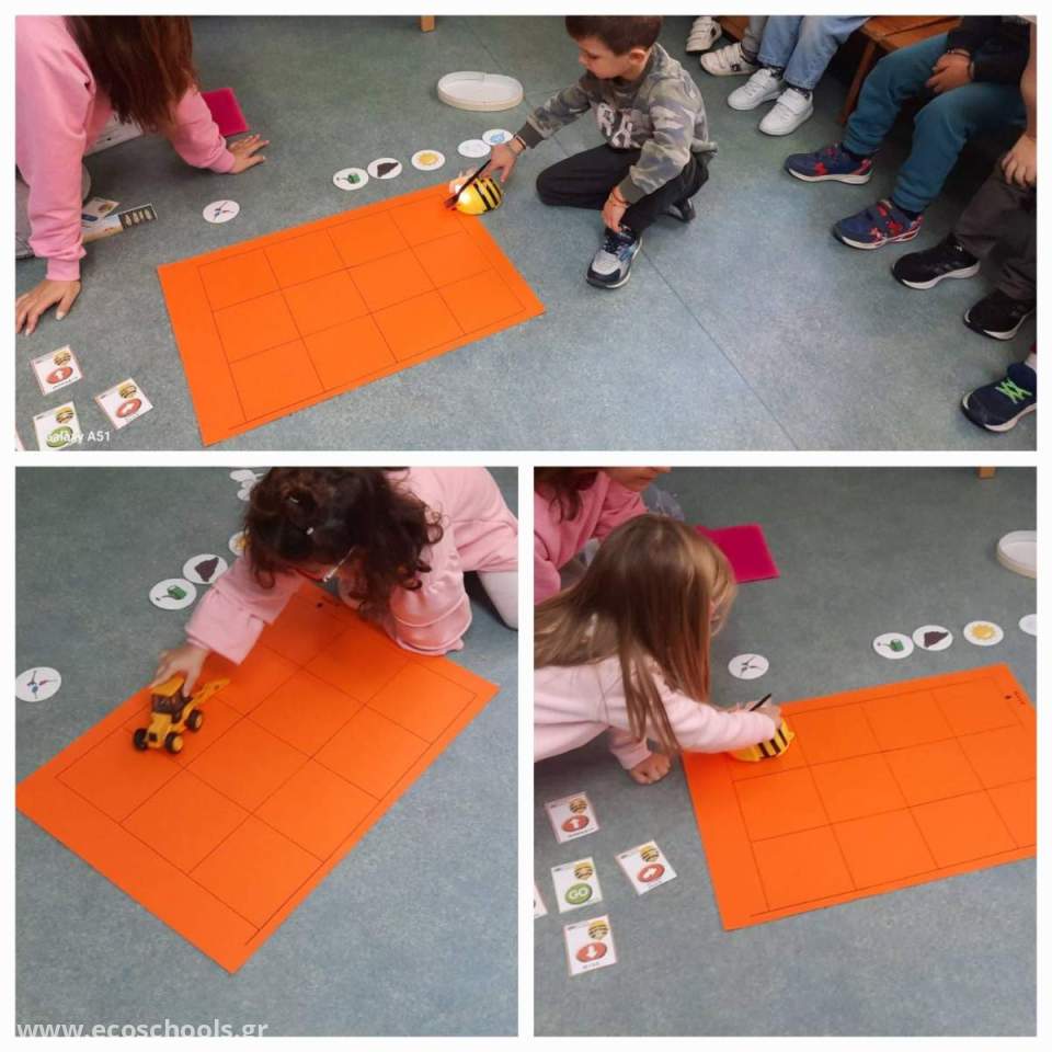 Στη συνέχεια, τα παιδιά μετέφεραν τη γνώση τους στον προγραμματισμό. Χωρισμένα σε ομάδες, σχεδίασαν τη διαδρομή που θα ακολουθούσε το ρομπότ Bee-Bot για να οργώσει το χωράφι, σκέφτηκαν ποια βήματα και εντολές χρειάζονται. Έπειτα παρουσίασαν τον τρόπο σκέψης τους στις υπόλοιπες ομάδες, εξηγώντας πώς επέλεξαν τη διαδρομή και πώς θα φτάσει το Bee-Bot στο χωράφι. Ήρθε η ώρα για δράση! Τα παιδιά πάτησαν τα κουμπιά, δοκίμασαν, διόρθωσαν, συνεργάστηκαν και τελικά το Bee-Bot όργωσε με επιτυχία το χωράφι.