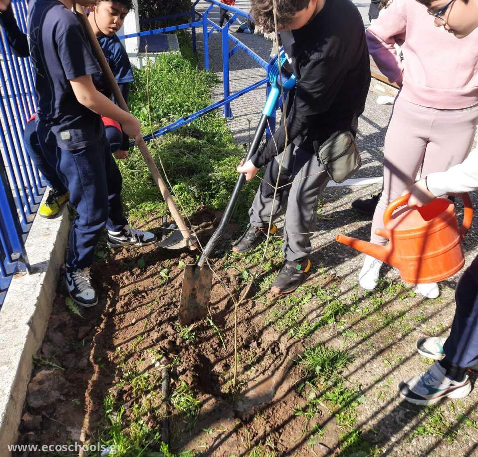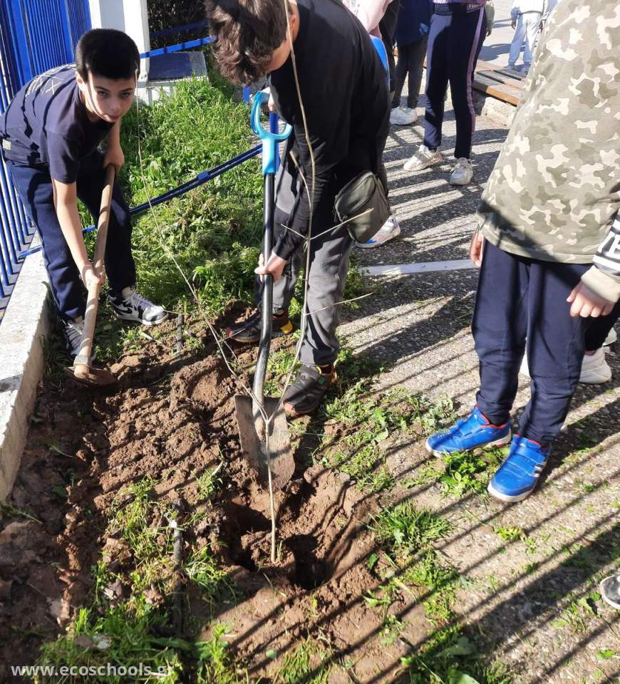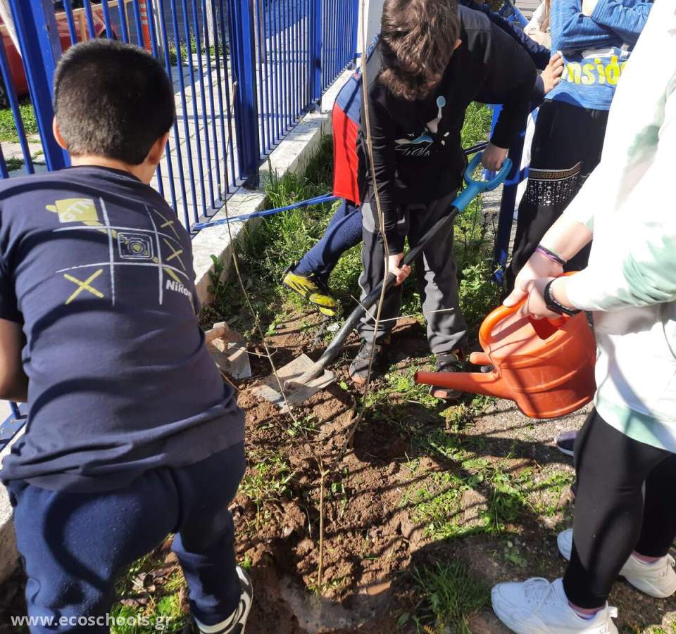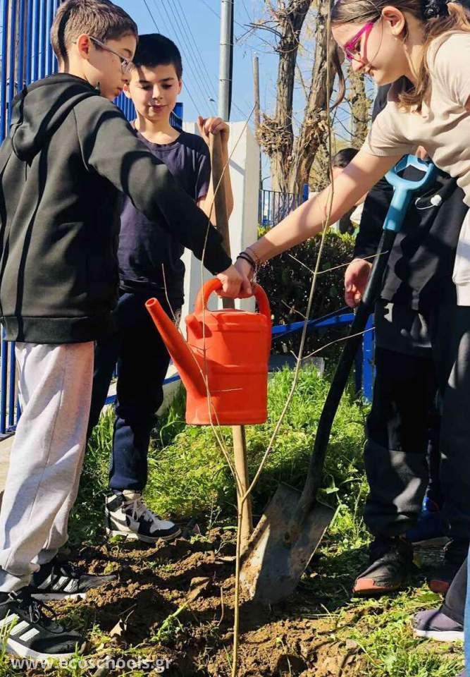Οι μαθητές/τριες των Ε και ΣΤ τάξεων προετοίμασαν τον χώρο, φύτεψαν, πότισαν τα μικρά δεντράκια και υποσχέθηκαν να τα φροντίζουν καθ'όλη τη διάρκεια τηςανάπτυξης τους.