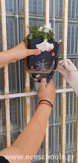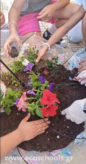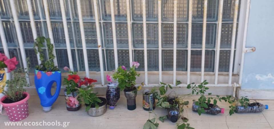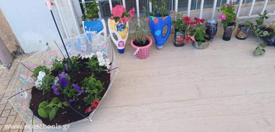 Το σχολείο μας συμμετέχει στο Μαθητικό διαγωνισμό " Design-Οικολογική τέχνη και περιβαλλοντικός σχεδιασμός" που υλοποιείται κατά τη φετινή και θα συνεχιστεί και την επόμενη σχολική χρονιά με την εκπ/κο Εικαστικών, κα. Δογκούρη Μυρσίνη και μαθητές του σχολείου μας. Στο πλαίσιο αυτό οι μαθητές της Ε΄τάξης φύτεψαν αρωματικά φυτά σε άδειες πλαστικές συσκευασίες που διαμόρφωσαν κατάλληλα, σε παλιά ομπρέλα , ανακυκλώνοντας αλλά και ομορφαίνοντας ταυτόχρονα τον εξωτερικό αύλειο χώρο του σχολείου μας.