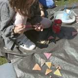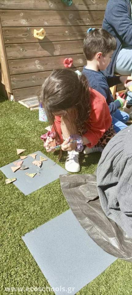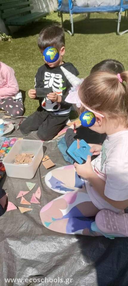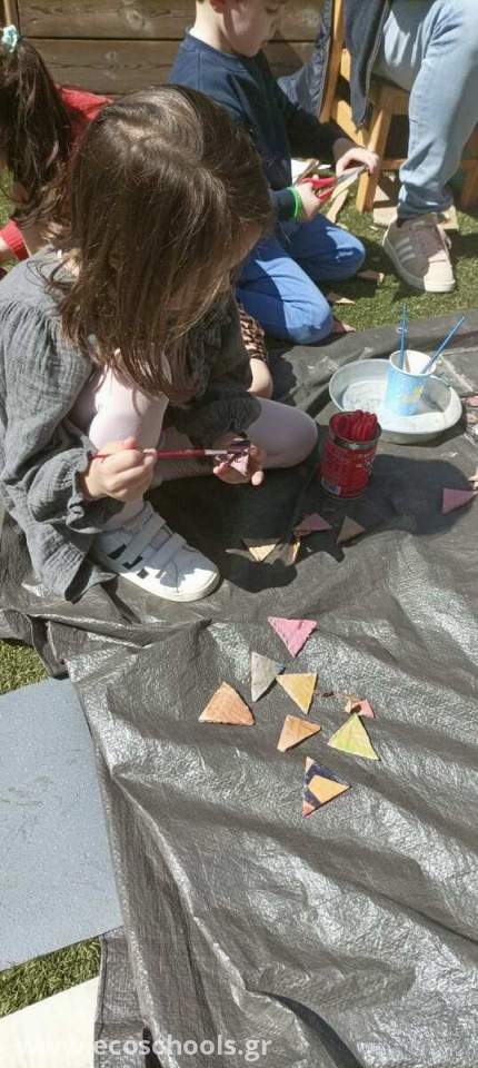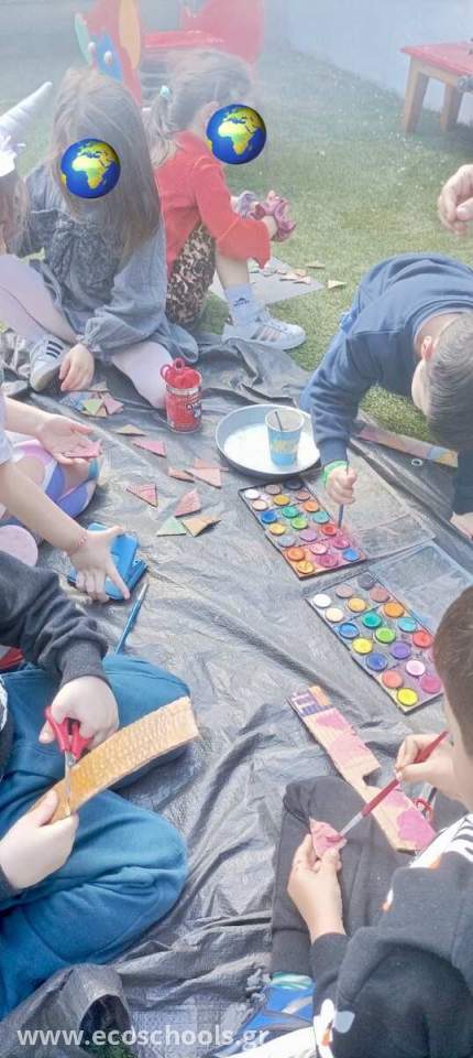 Στο μάθημα της Περιβαλλοντικής Αγωγής, οι μαθητές μας έκοψαν κομμάτια από κουτά σε τριγωνικό σχήμα, τα και τα ζωγράφισαν με νερομπογιές. Έπειτα, με την βοήθεια του διακορευτή άνοιξαν τρύπες στα κομμάτια και πέρασαν την κλωστή!Έτοιμο το φυλακτό μας!