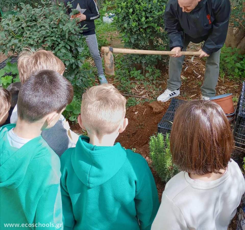 Πολλά παιδιά έφεραν γλαστράκια με τα παραπάνω βότανα και τα φυτέψαμε σε έναν χώρο που μέχρι τότε μύριζε άσχημα από τα περιττώματα γατών τις περιοχής και μάζευε πολλά κουνούπια και μύγες. Ο χώρος καθαρίστηκε, σκάφτηκε και περίμενε τους μικρούς μαθητές να φυτέψουν το γλαστράκι με το βότανο που έφεραν, όπως φαίνεται στις φωτογραφίες.