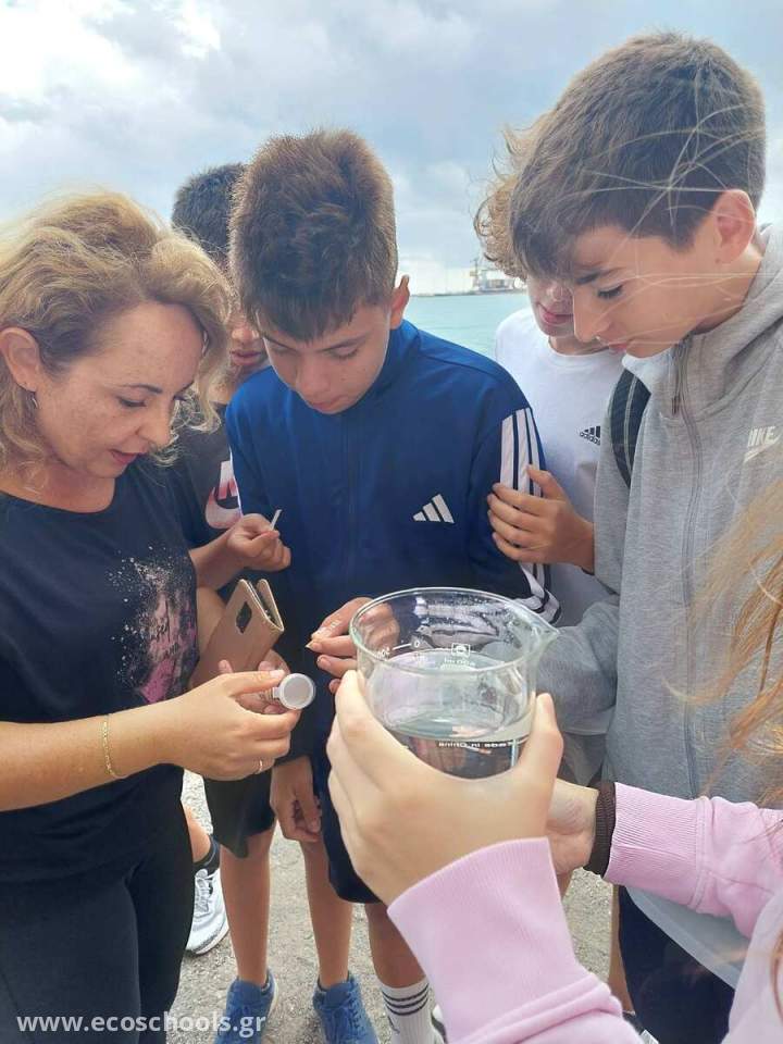 Στη συνέχεια οι μαθητές/τριες προσπάθησαν να εντοπίσουν, να καταγράψουν και να φωτογραφίσουν πιθανές πηγές ρύπανσης στην παραπάνω περιοχή. Τέλος, πήραν δείγμα θαλασσινού νερού, παρατήρησαν μερικούς φυσικούς δείκτες ποιότητας νερού (θολερότητα, οσμή, χρώμα), και έναν χημικό δείκτη ποιότητας του νερού, το pH, ενώ συζητήσαμε και για άλλους δείκτες ποιότητας του νερού (βιολογικούς, χημικούς και φυσικούς). Πρόκειται για δραστηριότητα (STEAM) η οποία σχεδιάστηκε από την καθηγήτρια ΧημεΙας, Ευαγγελία Λαγουδάκη στο πλαίσιο του προγράμματος περιβαλλοντικής “Chem Is Try Reducing pollution from water to sky!” το οποίο υλοποιεί φέτος στο σχολείο. Επίσης, μέρος της δράσης αποτελεί προτεινόμενη σχολική δραστηριότητα του Ευρωπαϊκού επιστημονικού προγράμματος iMermaid, το οποίο αφορά τη θαλάσσια ρύπανση και στο οποίο επίσης συμμετέχει το σχολείο μας φέτος.