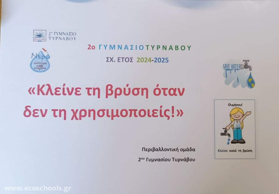 Κατά τη διάρκεια των πρώτων συναντήσεων της περιβαλλοντικής ομάδας του 2ου Γυμνασίου Τυρνάβου, οι μαθητές/τριες του προγράμματος "τρέχει, τρέχει... το νερό", αφού εξέφρασαν τους προβληματισμούς τους και συμμετείχαν ενεργά σε έναν ουσιαστικό διάλογο, τόσο μεταξύ τους όσο και με τις υπεύθυνες καθηγήτριες του προγράμματος, συνέχισαν με δραστηριότητες. Τους δόθηκαν δραστηριότητες για έρευνα και δράσεις για την εξοικονόμηση νερού στο σχολείου ενώ ταυτόχρονα οι μαθητές δημιούργησαν μια Λίστα Ελέγχου, με σκοπό την καταγραφή και αξιολόγηση των τρόπων κατανάλωσης και διαχείρισης του νερού στις εγκαταστάσεις του. Παράλληλα, δόθηκαν στους μαθητές δραστηριότητες για έρευνα και δράσεις για την εξοικονόμηση νερού στο σπίτι, οι οποίες περιείχαν και ερωτηματολόγιο με το οποίο καταγράφηκε η καθημερινή χρήση νερού στο σπίτι. Οι μαθητές, με τη βοήθεια των οικογενειών τους, κατέγραψαν και υπολόγισαν τα λίτρα νερού που καταναλώνουν κάθε μήνα για καθημερινές δραστηριότητες, όπως: Χρήση καζανακίου, Μπάνιο και ντους, Πλύσιμο χεριών, Λειτουργία πλυντηρίου ρούχων και πιάτων, Πλύσιμο λαχανικών και φρούτων, Πλύσιμο αυτοκινήτου κ.ά. Στο τέλος των δραστηριοτήτων οι μαθητές έδωσαν τα αποτελέσματα της έρευνας τους. Μέσα από αυτή τη διαδικασία, τα μέλη της ομάδας απέκτησαν μια σαφέστερη εικόνα της κατανάλωσης νερού στην καθημερινότητά τους και προβληματίστηκαν πάνω στις πιθανότητες εξοικονόμησης. Στο τέλος, κλήθηκαν να διατυπώσουν προτάσεις και λύσεις για τη μείωση της άσκοπης σπατάλης, συμβάλλοντας έτσι ενεργά στην ευρύτερη περιβαλλοντική προσπάθεια για την προστασία αυτού του πολύτιμου φυσικού πόρου. Έτσι, οι μαθητές πρότειναν και δημιούργησαν πινακίδες, τις οποίες κρέμασαν στις τουαλέτες μαθητών και εκπαιδευτικών στέλνοντας τα μηνύματα τους για εξοικονόμηση νερού. Η δράση αυτή αποτέλεσε ένα πρώτο, αλλά πολύ ουσιαστικό βήμα, στον δρόμο για την περιβαλλοντική ευαισθητοποίηση και ενεργοποίηση των μαθητών του σχολείου μας. Δραστηριότητες -έρευνα -αποτελέσματα