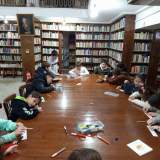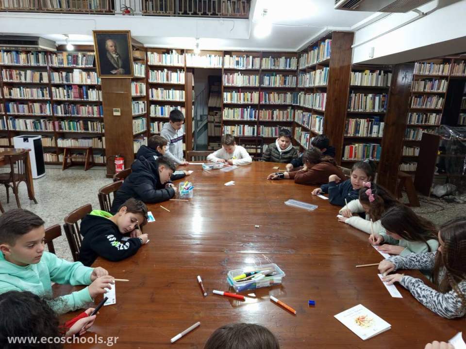 Την Παρασκευή, 14 Φεβρουαρίου 2025, οι μαθητές της Ε τάξης επισκέφθηκαν τη Δημοτική Βιβλιοθήκη Πατρών, όπου όλοι οι μαθητές συμμετείχαν σε μία δράση σχετική με την οικολογία και το φυσικό περιβάλλον που είναι άρρηκτα συνδεδεμένο με το χώρο της σχολικής αυλής. Αφού άκουσαν ένα απόσπασμα από το βιβλίο του Ζαχαρία Παπαντωνίου «Τα ψηλά βουνά», πήραν από την υπεύθυνη της βιβλιοθήκης έτοιμους σελιδοδείκτες (κομμένα λευκά χαρτονάκια), στον καθένα από τους οποίους ήταν εκτυπωμένη μία στροφή από το ποίημα που περιελάμβανε το απόσπασμα του προαναφερομένου βιβλίου. Αμέσως μετά κάθε μαθητής ζωγράφισε πάνω στον σελιδοδείκτη την εικόνα που του έφερναν στον νου οι στίχοι του ποιήματος για το δάσος και τα δέντρα, που ήταν γραμμένοι στο