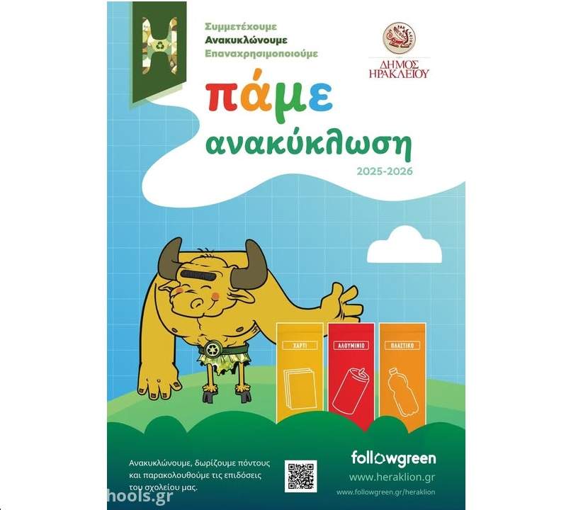 Ο Δήμος Ηρακλείου έδωσε το σήμα της εκκίνησης και φέτος τον Νοέμβριο κι εμείς πιάνουμε δουλειά: Ορίσαμε σε κάθε ένα από τα 25 τμήματα τον/την Υπεύθυνο/η Ανακύκλωσης, ο οποίος θα είναι και μέλος της Περιβαλλοντικής Επιτροπής, και προσπαθούμε να μη μείνει ούτε ένα σκουπιδάκι εκτός κάδου!