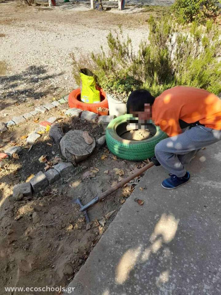 Για την διαμόρφωση του εξωτερικού χώρου του εργαστηρίου Γεωπονίας, Τροφίμων και Περιβάλλοντος, οι μαθητές μας είχαν την ιδέα να βρουν παλιά λάστιχα και να τα μετατρέψουν σε μικρούς βραχόκηπους. Με χρώματα και πολύ φαντασία ο κήπος μας ομόρφυνε δίνοντας ξανά ζωή σε παλιές ρόδες,