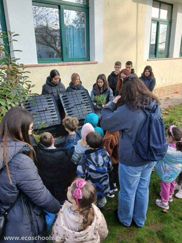 Οι μαθητές του σχολείου μας ανέλαβαν να ξεναγήσουν τους μικρούς επισκέπτες στον λαχανόκηπο και στους κομποστοποιητές μας, εξηγώντας τον ρόλο τους και τη σημασία τους για το περιβάλλον.