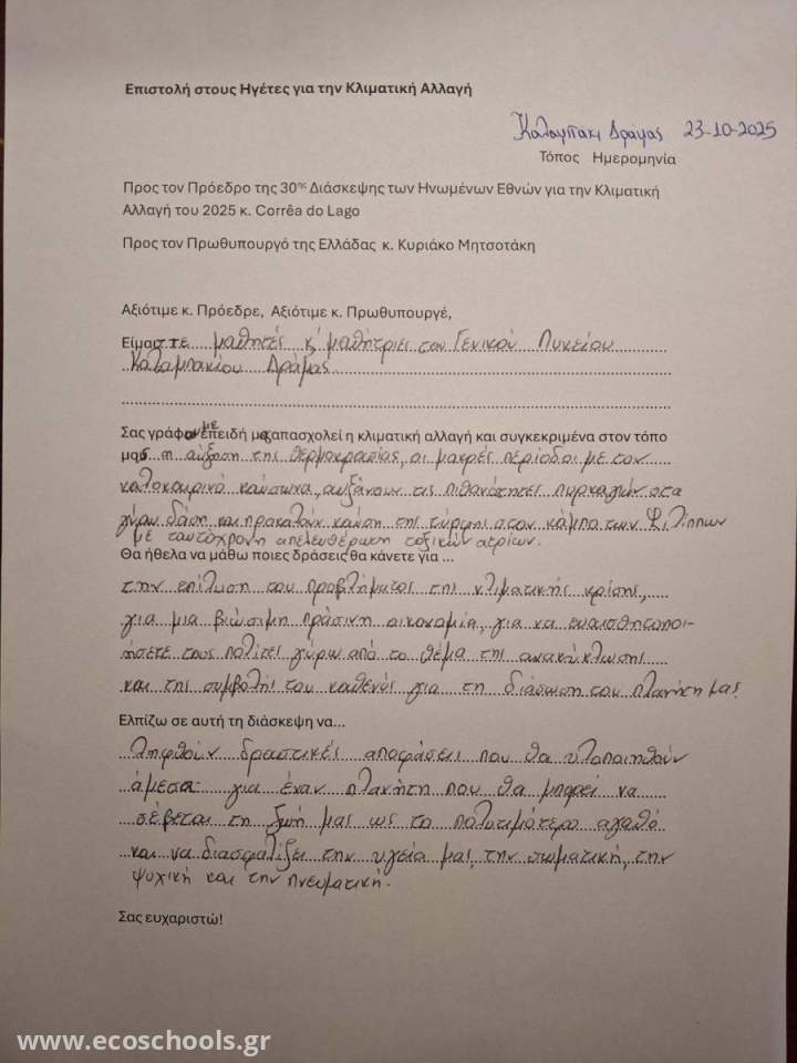 [💚] Με τις επιστολές τους, οι μαθητές εξέφρασαν την ανησυχία και την ευαισθησία τους απέναντι στην κλιματική κρίση, καλώντας σε άμεση και ουσιαστική δράση για την προστασία του περιβάλλοντος και του κοινού μας μέλλοντος.