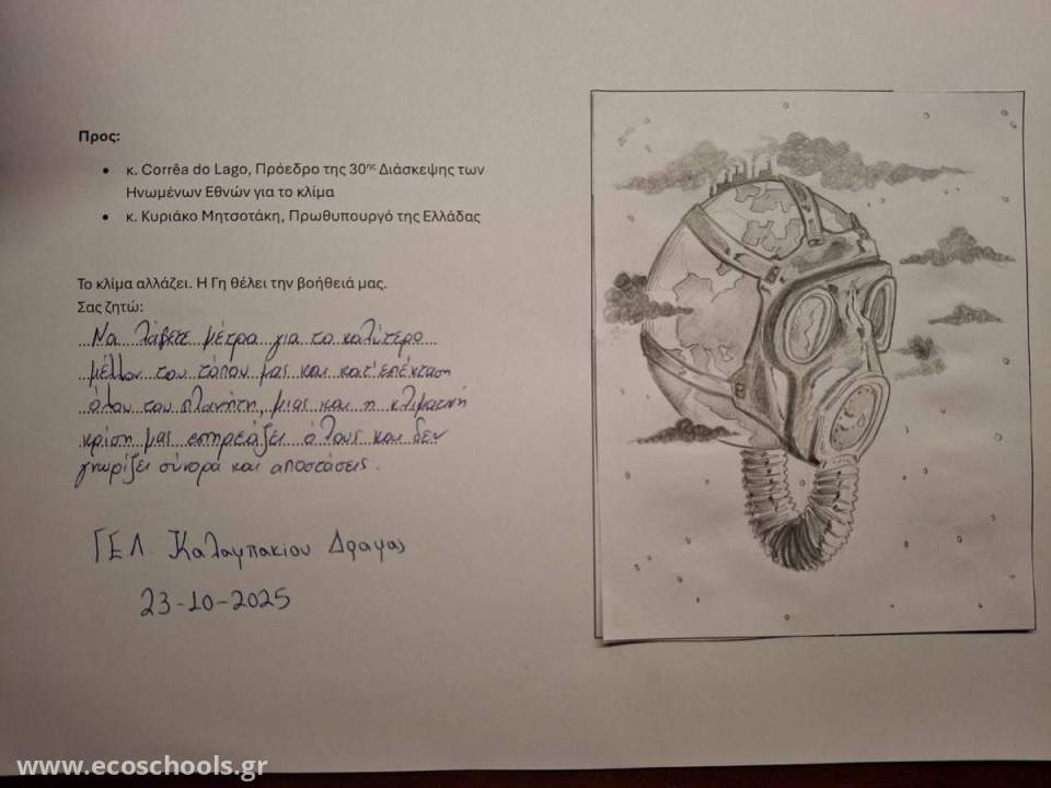 [🎨] Τις επιστολές συνόδευσαν ζωγραφιές μαθήτριας της Α΄ Λυκείου, που απεικονίζουν τα προβλήματα που ήδη βιώνουμε λόγω της κλιματικής κρίσης – εικόνες που συγκινούν, προβληματίζουν και μας υπενθυμίζουν την ευθύνη όλων μας απέναντι στη Γη.