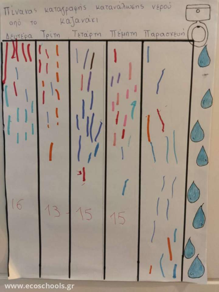 Σχέδιο εξοικονόμησης καθαρού νερού στο Νηπιαγωγείο 1. Αρχικά φτιάξαμε έναν ημερήσιο πίνακα καταγραφής και ορίσαμε ομάδες εποπτείας. 2.Καθημερινά για μια εβδομάδα (5 ημέρες) καταγράφαμε τη χρήση νερού στα 2 καζανάκια. 3. Αφού ολοκληρώθηκε η καταγραφή προχωρήσαμε στην καταμέτρηση και απαντήσαμε στο ερώτημα : Πόσες φορές ‘πατήσαμε’ το καζανάκι την κάθε ημέρα; 4. Πειραματιστήκαμε για να βρούμε τον τρόπο υπολογισμού του μέσου όρου κατανάλωσης και καταλήξαμε να χρησιμοποιήσουμε τους μαρκαδόρους. Διαπιστώσαμε ότι χρησιμοποιούμε περίπου 20 φορές την ημέρα τα καζανάκια στο Νηπιαγωγείο μας .