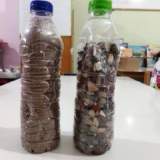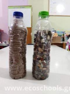 5. Αφού μάθαμε την ποσότητα της κατανάλωσης, έπειτα έπρεπε να σκεφτούμε τρόπους για να εξοικονομήσουμε μεν νερό αλλά τα καζανάκια μας δε να παραμείνουν λειτουργικά .Επιπλέον η εξοικονόμηση νερού χρειαζόταν να είναι σε μετρήσιμα μεγέθη .Μετά από καταιγισμό ιδεών και δεκάδες προτάσεις, αποφασίσαμε να τοποθετήσουμε από ένα χρησιμοποιημένο πλαστικό μπουκαλάκι 0,5 λίτρου από νερό στο κάθε καζανάκι. Τότε προέκυψε το ζήτημα της άνωσης. 6. Ήρθε η ώρα των γονέων. Ζητήσαμε από γονείς ,το Σαββατοκύριακο που θα έκαναν βόλτα στην παραλία, να μας γεμίσουν τα 2 μπουκαλάκια με χαλίκι.
