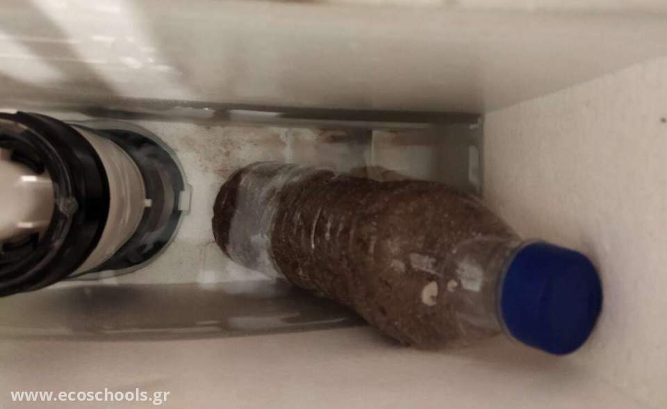 7. Τοποθετήσαμε από ένα μπουκαλάκι σε κάθε καζανάκι, σύμφωνα με την υπόθεσή μας δεν επέπλεαν ,και τελικά παρατηρήσαμε ότι μείωσαν την ποσότητα νερού με την οποία γέμιζαν τα καζανάκια με τρόπο όπου μπορούσαμε να μετρήσουμε. Εξοικονομούσαμε 0,5 λίτρα νερού σε κάθε χρήση.