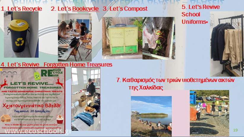 - Μείωση Οικολογικού αποτυπώματος από τις δύο περιβαλλοντικές δράσεις: επαναχρησιμοποίησης βιβλίων και χρήση επαναχρησιμοποιούμενων μπουκαλιών