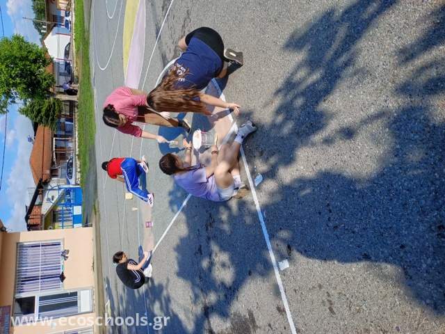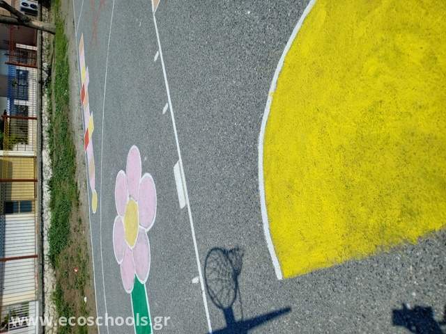 Οι μαθητές/τριες της Πέμπτης και της Έκτης τάξη ασχολήθηκαν με τη φροντίδα του χώρου. Χωρισμένοι ανά τάξη σε ομάδες εργασίας, έκαναν υπολογισμούς, μέτρησαν, χάραξαν γραμμές κι έβαψαν τα τμήματα των παιχνιδιών και των γηπέδων που έπρεπε να ανακατασκευαστούν.