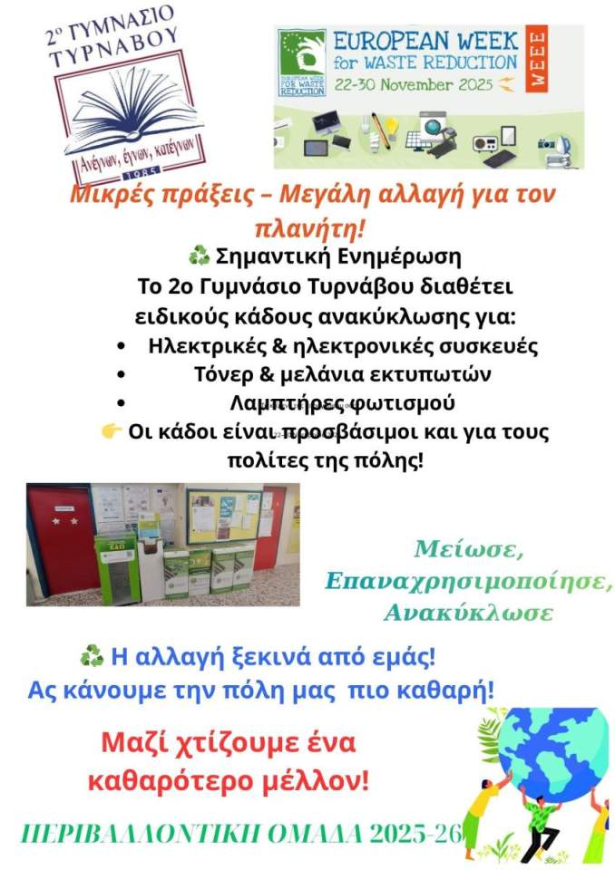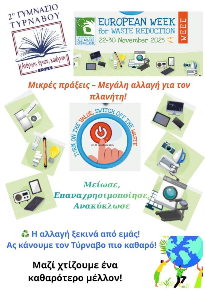 #EWWR2025 #ΜείωσηΑποβλήτων #Ανακύκλωση #ΑΗΗΕ #2οΓυμνάσιοΤυρνάβου #Περιβάλλον #ΠράσινηΠόλη #Reuse #Recycle #Reduce