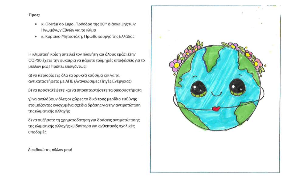 Η πρωτοβουλία οργανώθηκε από την Ελληνική Εταιρία Προστασίας της Φύσης και το WWF Ελλάς, προσκαλώντας σχολικές κοινότητες από όλη τη χώρα να στείλουν μηνύματα, επιστολές και κάρτες προς τον Πρωθυπουργό της Ελλάδας και τον Πρόεδρο της COP30. Οι μαθητές μας ανταποκρίθηκαν με ενθουσιασμό, εκφράζοντας τις ανησυχίες και τις ελπίδες τους για ένα βιώσιμο μέλλον, μέσα από λόγια γεμάτα ευαισθησία, φαντασία και περιβαλλοντική συνείδηση.