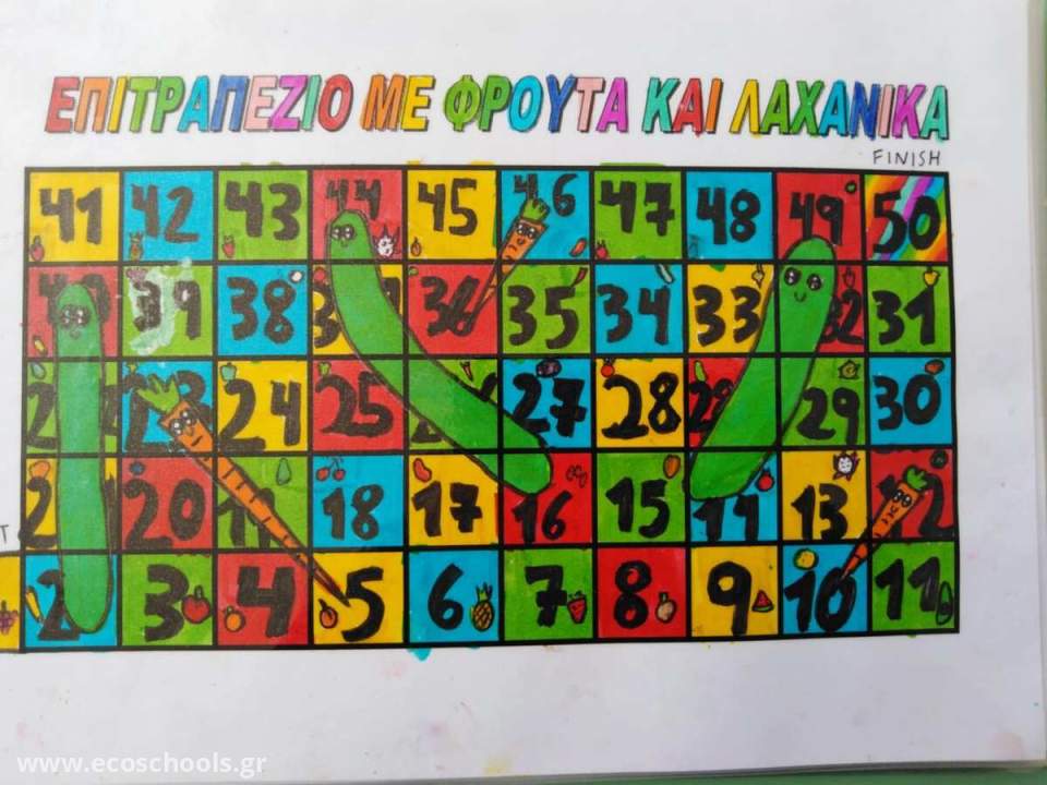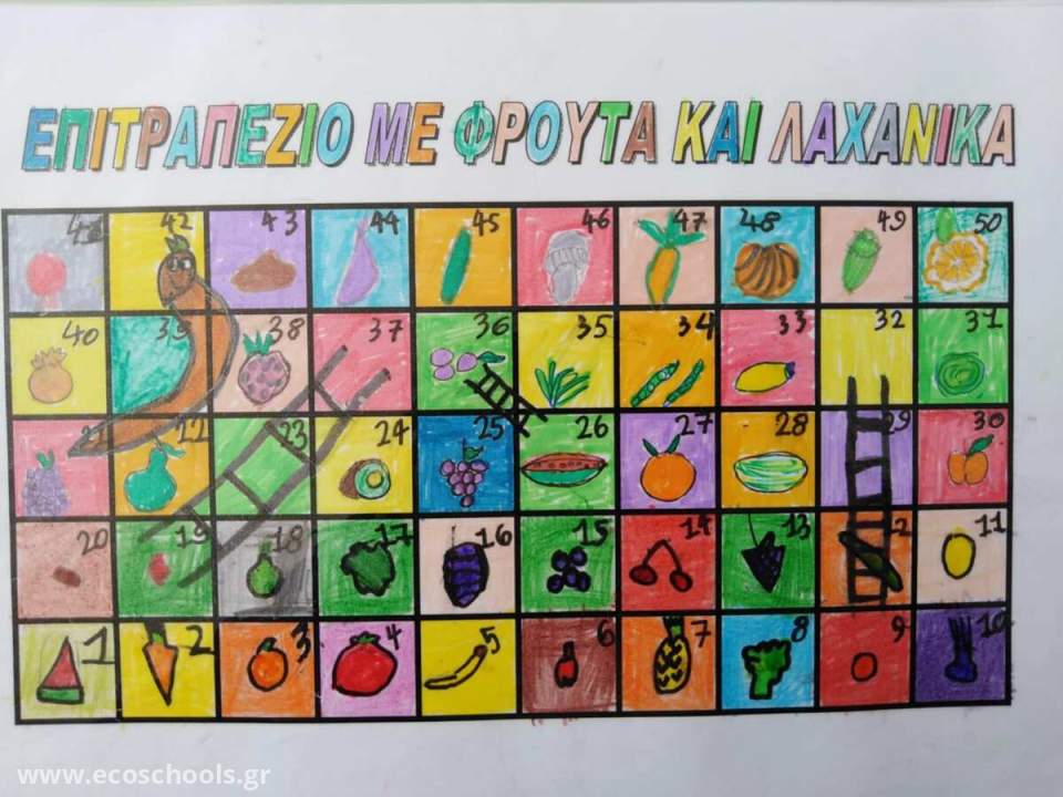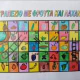 Επιτραπέζια παιχνίδια με θέμα τα φρούτα και τα λαχανικά. Τα παιδιά του Δ΄1 εικονογράφησαν με δικές τους ιδέες πάνω στα ταμπλό που τους είχαν δοθεί, δυο διαφορετικά είδη επιτραπέζιου παιχνιδιού.