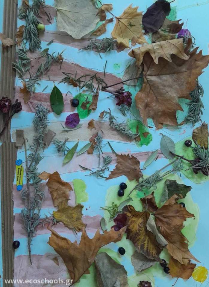 Φθινοπωρινό δάσος από τα παιδιά της πρώτης δημοτικού. φύλλα που μάζεψαν από την αυλή του σχολείου οι μικροί μαθητές και έφεραν την φύση μέσα στην τάξη.