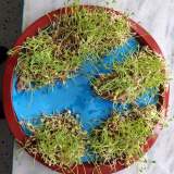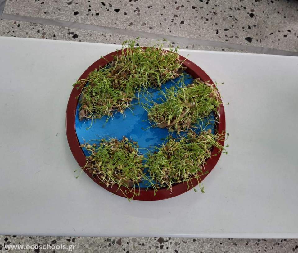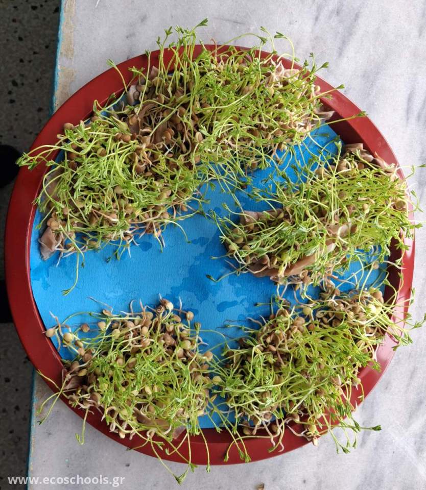 Μεταφέραμε προσεκτικά τις φυτρωμένες φακές σε έναν δίσκο. Εκεί, ζωγραφίσαμε τους γαλάζιους ωκεανούς και, χρησιμοποιώντας τις πράσινες βλαστήσεις μας, συνθέσαμε τις πέντε ηπείρους: την Ευρώπη, την Ασία, την Αφρική, την Αμερική και την Ωκεανία.