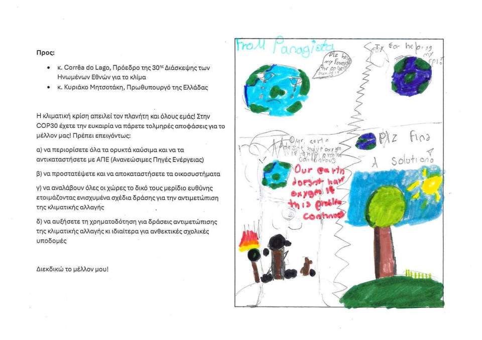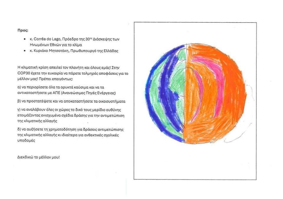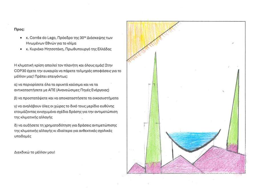 Σε λίγο καιρό οι παγκόσμιοι ηγέτες συναντιούνται στη Βραζιλία για να συζητήσουν τα μέτρα που λαμβάνουν για τη κλιματική κρίση. Πρόκειται για την 30η διεθνή συνάντησή που συγκαλεί ο ΟΗΕ για το θέμα («Conference of Parties», COP30, Bραζιλία, 10-21 Nοεμβρίου 2025). Είναι σημαντικό να νιώσουν όλοι οι σύνεδροι στη Βραζιλία ότι νοιαζόμαστε, ανησυχούμε και απαιτούμε να ληφθούν γενναία μέτρα για την αντιμετώπιση της κλιματικής κρίσης. Ενώνουμε τις δυνάμεις μας, η Ελληνική Εταιρία Προστασίας της Φύσης (ΕΕΠΦ), το WWF Ελλάς, οι μαθητές όλης της χώρας, για να ακουστεί η φωνή των μαθητών/τριών στη Βραζιλία.