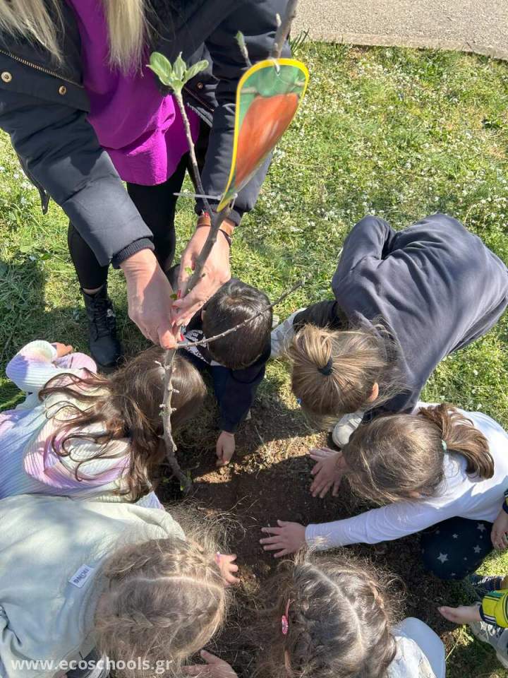 Με αφορμή την Παγκόσμια ημέρα δασών στις 21 Μαρτίου αποφασίσαμε με τα παιδιά να φυτέψουμε κάποια καινούργια δέντρα στο σχολείο μας. Αφού είχαμε ήδη ζητήσει τη συνδρομή του δασαρχείου για την προμήθεια κάποιων δεντρυλλίων αλλά και των γονέων για να μας βοηθήσουν με το σκάψιμο, υποδεχτήκαμε με χαρά δύο μηλιές, μια κερασιά, μια ελιά, ένα κυπαρίσσι αλλά και καλλωπιστικά φυτά. Αφού σκάψαμε, φυτέψαμε, ρίξαμε χώμα από το δικό μας κομποστ, ποτίσαμε τα νέα μας δέντρα, τραγουδήσαμε ένα τραγούδι που ετοιμάσαμε εδώ και μέρες με τα παιδιά.