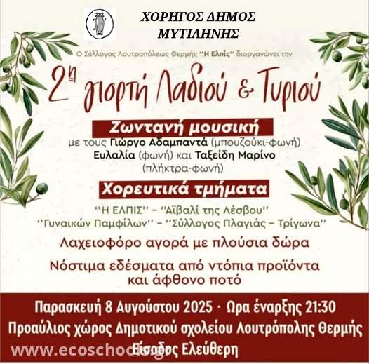 @ Με απόλυτη επιτυχία στέφθηκε η 2η Γιορτή Λαδιού και Τυριού, που οργανώθηκε χθες στην αυλή του Δημοτικού Σχολείου της Θερμής από τον Σύλλογο της κωμόπολης «Ελπίς». Πολύς κόσμος, εκλεκτοί μεζέδες, γλέντι και χορός μέχρι αργά το βράδυ.