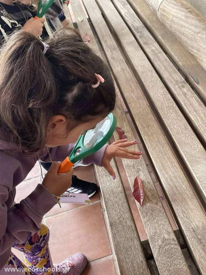 1η ΟΜΑΔΑ- Τα παιδιά με φακούς παρατήρησαν τα δέντρα και τα φυτά της αυλής, και με τη βοήθεια του γεωπόνου έμαθαν για την καλλιέργεια και τις ανάγκες τους. Παράλληλα έψαξαν και βρήκαν έντομα που ζουν στην αυλή και με τους φακούς τα παρατήρησαν κι έμαθαν για τη ζωή τους, και τις συνήθειές τους.