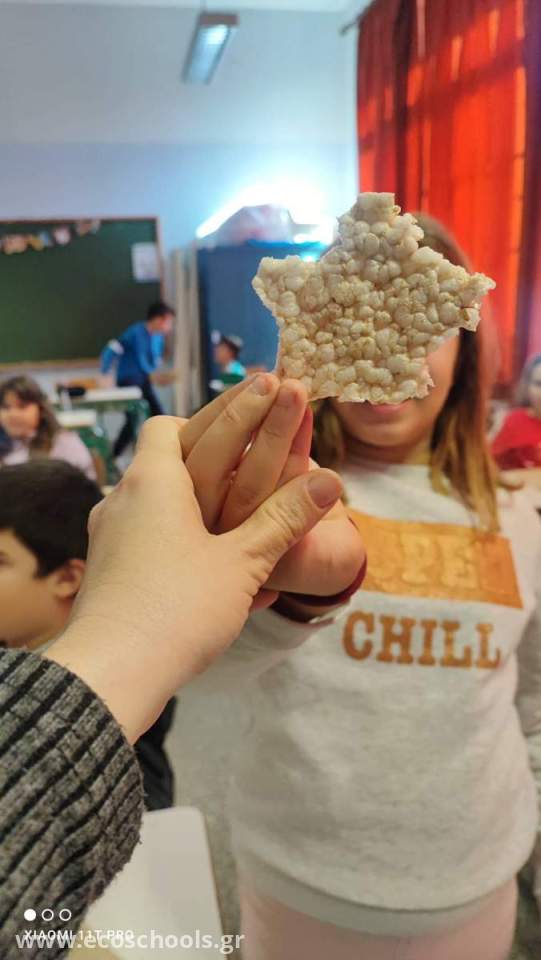 Στη συνέχεια, τα παιδιά πήραν ρόδια, τα έκοψαν στη μέση και τα πέρασαν πάνω στη γιρλάντα. Πάνω στην ίδια γιρλάντα τοποθέτησαν και ριζογκοφρέτες, τις οποίες είχαν προηγουμένως κόψει με κουπ-ατ σε σχήμα αστεριού, δημιουργώντας ακόμη περισσότερες φαγώσιμες και ελκυστικές εκπλήξεις για τα πουλιά. Οι γιορτινές, θρεπτικές γιρλάντες και τα στολίδια των παιδιών τοποθετήθηκαν στα δέντρα της σχολικής αυλής, προσφέροντας χαρά, τροφή και χρώμα στους φτερωτούς επισκέπτες μας, που τον χειμώνα δυσκολεύονται περισσότερο να βρουν τροφή.