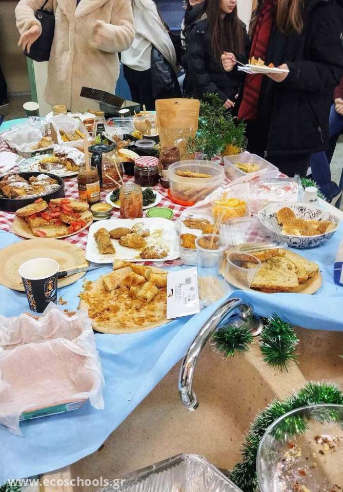 Η Περιβαλλοντική Ομάδα προετοίμασε και σέρβιρε παραδοσιακό Χριστουγεννιάτικο Δεκατιανό στους μαθητές/μαθήτριες του σχολείου σε μια προσπάθεια να προβληθεί η φιλοσοφία του Zero Waste (μη σπατάλη τροφίμων) που θα πει μηδενικά απορρίμματα. Η φιλοσοφία αυτή αφορά στη διατήρηση πόρων μέσω υπεύθυνης κατανάλωσης, επαναχρησιμοποίησης προϊόντων ώστε να μειωθούν τα απόβλητα από το έδαφος ή το νερό. Με δράσεις σαν αυτή, γίνεται κατανοητό στην πράξη ότι υπάρχουν επιλογές που θα πρέπει όλοι να υιοθετήσουμε αν θέλουμε να ζούμε σε ένα καθαρό περιβάλλον. Οι συσκευασίες που χρησιμοποιήθηκαν προορίζονταν για ανακύκλωση ενώ δεν υπήρχαν επεξεργασμένα τρόφιμα.
