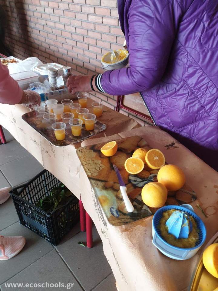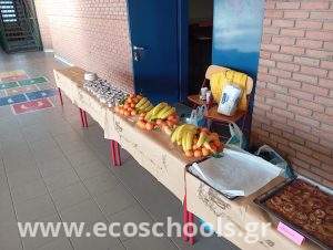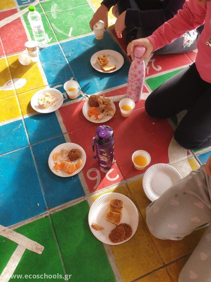 Το πρωινό μας περιλάμβανε φρούτα, όπως ρόδια, πορτοκάλια, μανταρίνια και μπανάνες, αλλά και εδέσματα, όπως μεσογειακή πίτσα (με τυρί, πιπεριά και ελιές), ελιόψωμο, μηλόπιτα , κέικ πορτοκάλι και μπισκότα βρώμης ( χωρίς ζάχαρη με μέλι, σταφίδες, μπανάνα). Τόσο τα παιδιά, όσο και οι εκπαιδευτικοί, έμειναν ενθουσιασμένοι/ες με την ποιότητα, την υψηλή διατροφική αξία των προϊόντων, αλλά και την άριστη οργάνωση της όλης δράσης.
