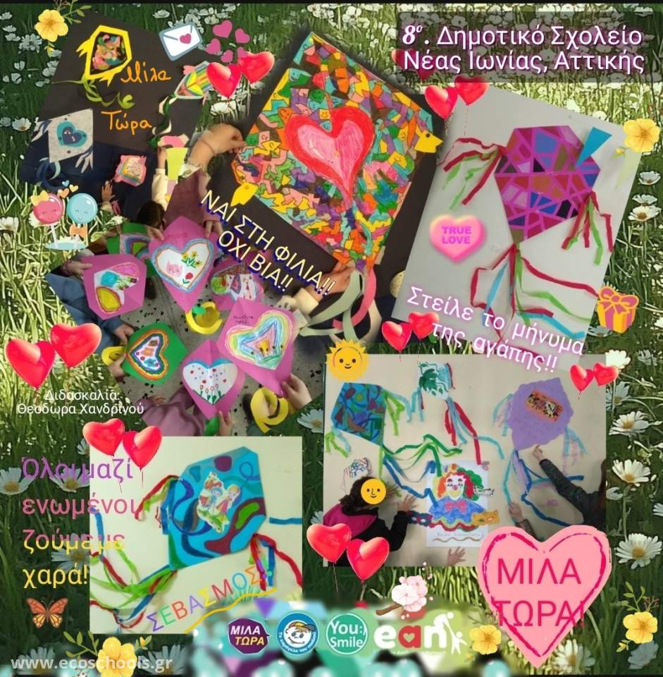 Το σχολικό έτος 2024-2025 στο 8ο Δημοτικό Σχολείο Νέας Ιωνίας, Αττικής τα παιδιά είχαν την ευκαιρία να συμμετέχουν σε πολλές βιωματικές δράσεις. Στο πλαίσιο της διδασκαλίας των Εικαστικών έγιναν εργασίες ατομικές και ομαδικές με αφορμή την ημέρα ενάντια στον σχολικό εκφοβισμό και την βία.