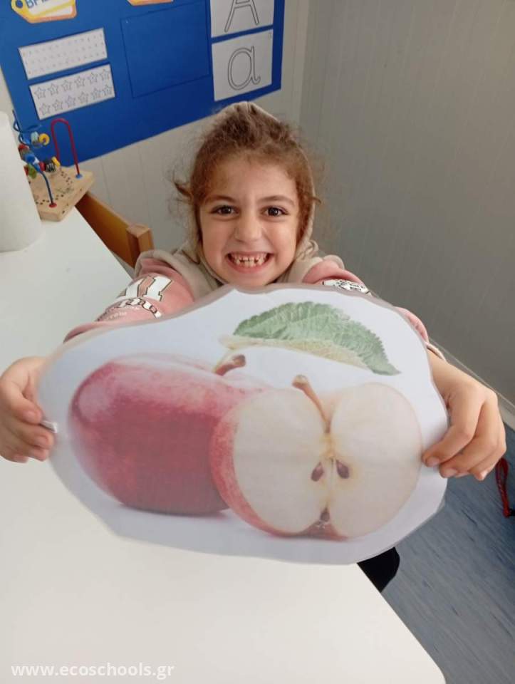 Μήλο → άλματα 3 φορές «γιατί το μήλο μας δίνει ενέργεια».
