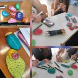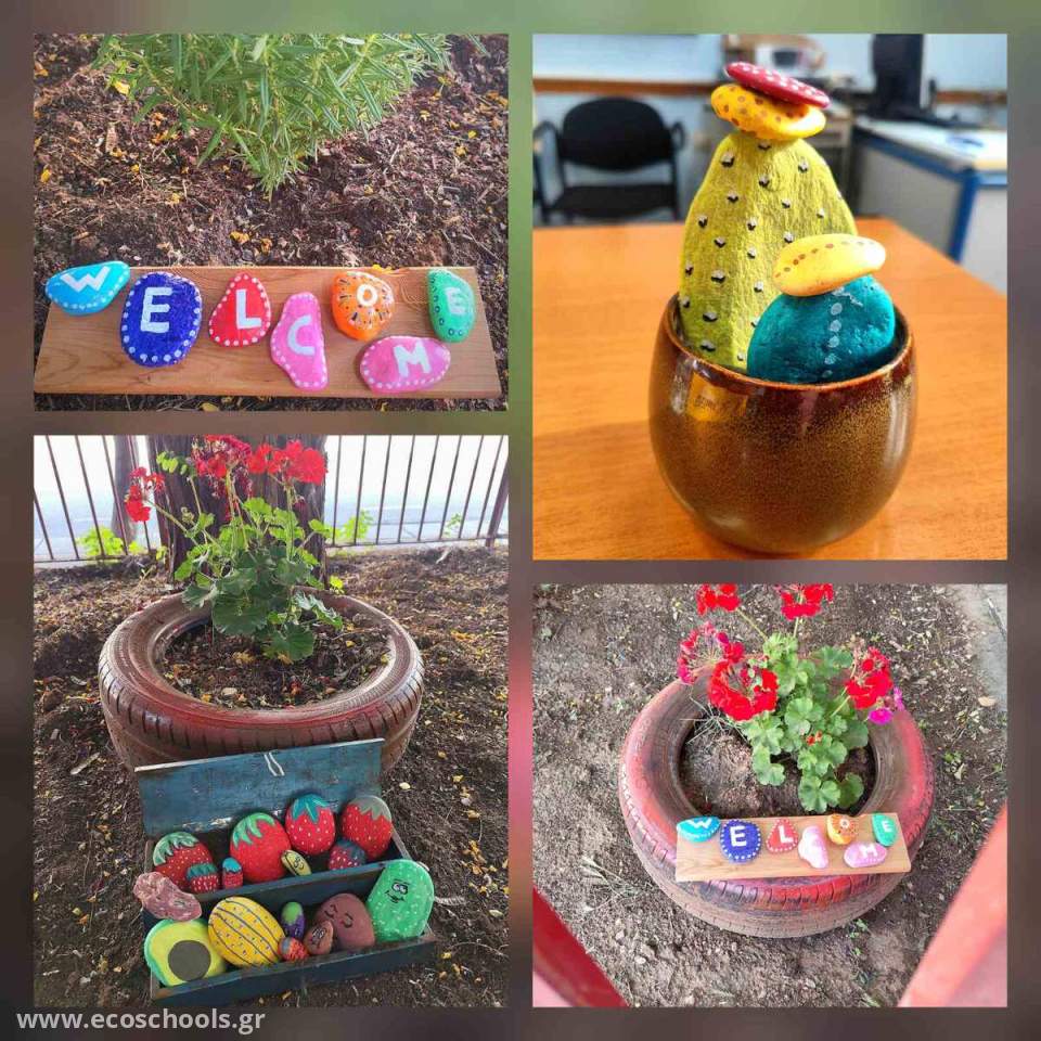 Κεντρική μας ιδέα ήταν η διακόσμηση του χώρου με ζωγραφισμένες πέτρες, πάνω στις οποίες οι μαθητές-τριες αποτύπωσαν σχέδια και εικόνες που σχετίζονται με τη φύση, τη γεωργία και την οικολογική συνείδηση. Οι πέτρες συλλέχθηκαν με υπευθυνότητα από παραλίες και εξοχές, δίνοντας έτσι ιδιαίτερη αξία στη χρήση φυσικών και ανακυκλώσιμων υλικών, χωρίς να επιβαρύνουμε το περιβάλλον. Με ακρυλικούς μαρκαδόρους και πολλή φαντασία, κάθε μαθητής ανέλαβε να μεταμορφώσει μια απλή πέτρα σε ένα μικρό έργο τέχνης.
