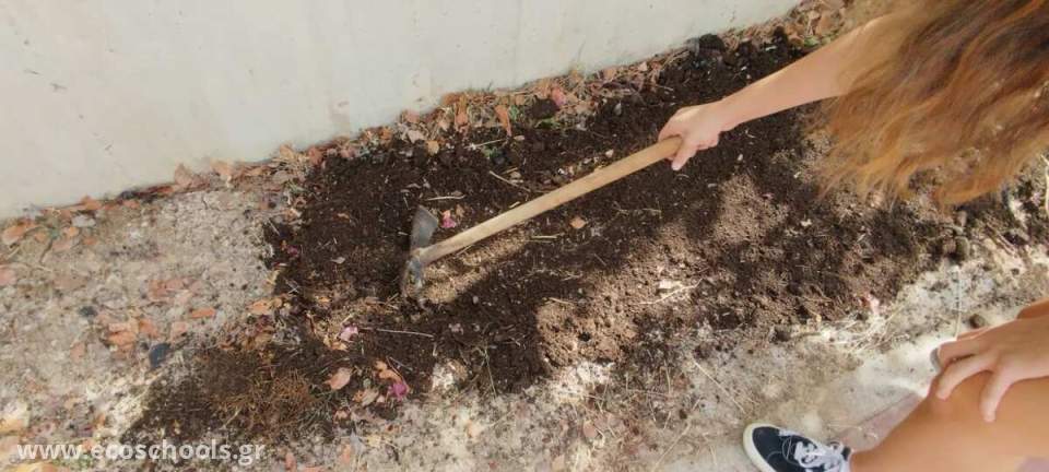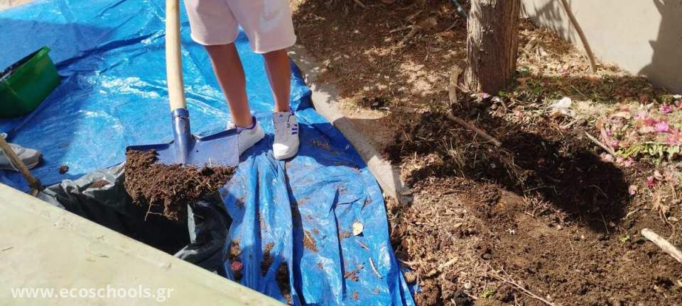 Στο πλαίσιο της περιβαλλοντικής μας δράσης, αξιοποιήσαμε το κομπόστ 200 lt που δημιουργήθηκε την προηγούμενη σχολική χρονιά από τα οργανικά υπολείμματα του σχολείου. Το πλούσιο σε θρεπτικά συστατικά χώμα χρησιμοποιήθηκε για τον εμπλουτισμό των παρτεριών μας, ενισχύοντας την ανάπτυξη των φυτών και δίνοντας νέο χρώμα και ζωντάνια στον σχολικό μας χώρο. Με αυτόν τον τρόπο, αποδείξαμε στην πράξη ότι η κομποστοποίηση δεν είναι μόνο μια διαδικασία ανακύκλωσης, αλλά και ένας κύκλος ζωής που επιστρέφει στο περιβάλλον ό,τι του ανήκει. Παράλληλα, προετοιμάσαμε εκ νέου τον κομποστοποιητή, ώστε η δράση να συνεχιστεί και τη φετινή χρονιά
