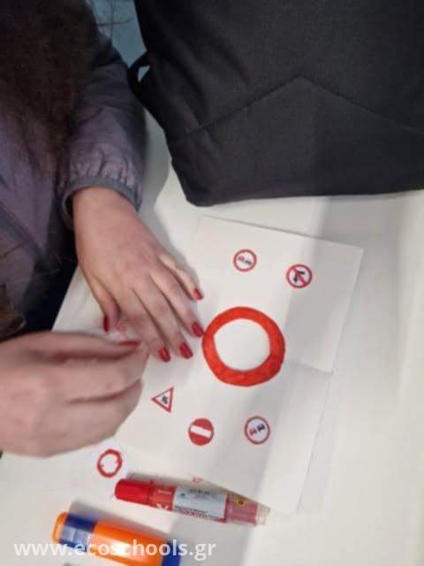 Συγκεκριμένα, δημιούργησαν μικρές καρτέλες με σήματα, τις πλαστικοποίησαν και τις χρησιμοποίησαν ώστε να μπορούν να τοποθετούνται και να αφαιρούνται από τις αντίστοιχες σελίδες. Για παράδειγμα, στη σελίδα με κόκκινο φόντο, κολλούν τα σήματα απαγόρευσης, στην μπλε σελίδα, τα σήματα υποχρέωσης, στη σελίδα με τον κυκλικό κόμβο, τα παιδιά πειραματίζονται με διαφορετικές σημάνσεις και διαμορφώνουν την κυκλοφοριακή ροή και τις προτεραιότητες των οχημάτων.